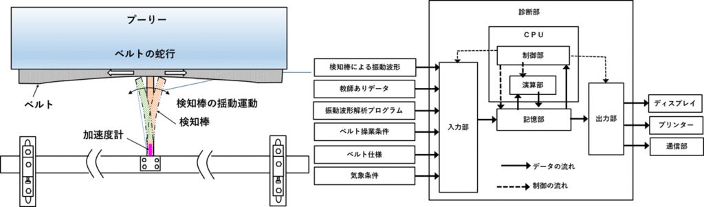 「ベルト下部に押し当てた検知棒の振動をAIで解析し、摩耗・蛇行・破孔・縦裂きなど多様な異常を早期に検知できる監視装置」 です。