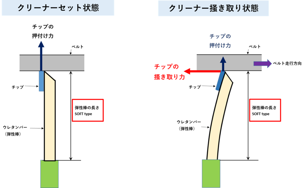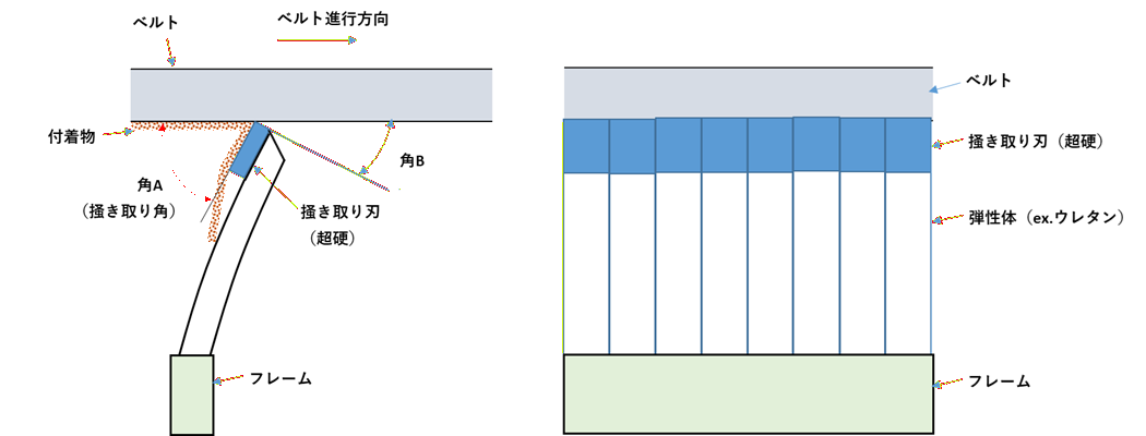 強く押付けるほど掻き取り状態は向上するがベルトや掻き取り刃の摩耗を促進します。