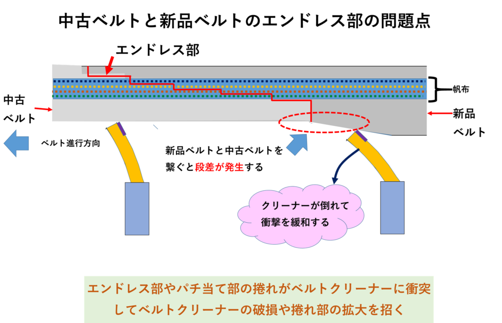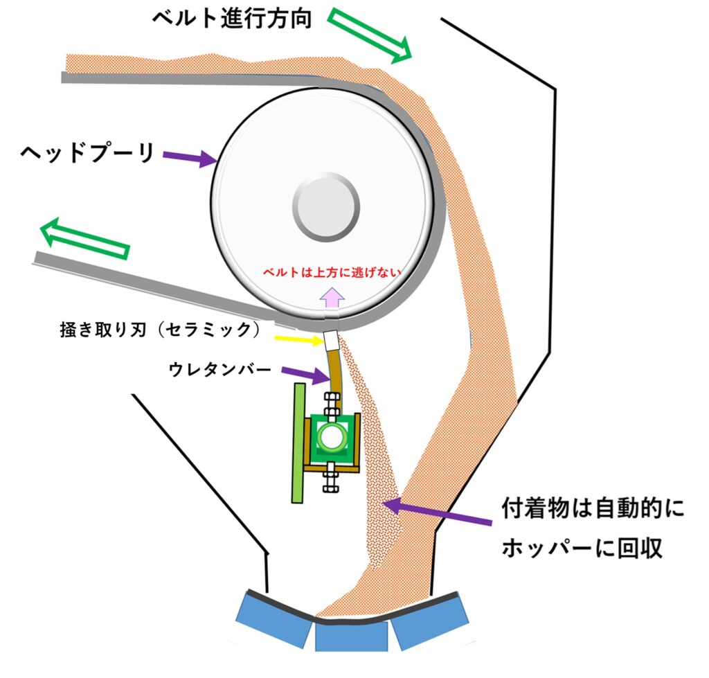 付着物がベルトと掻き取り刃の間をすり抜ける