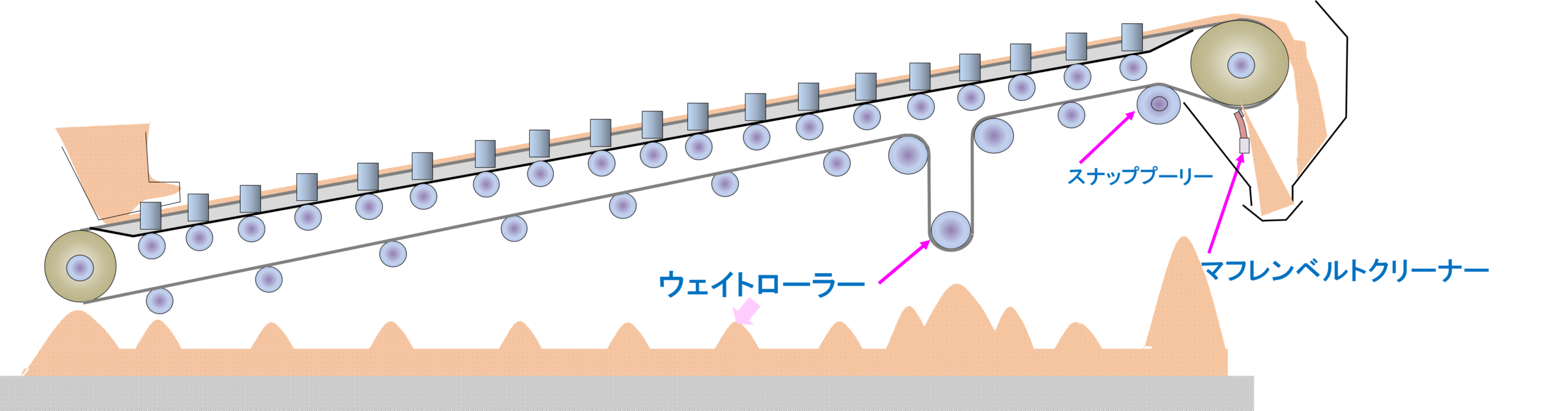 ベルトコンベアの付着物と落鉱はコンベア輸送に於いて避けられない現象であり、これから生じてくる落下防止対策と清掃作業は永遠に繰り返される必須作業です。