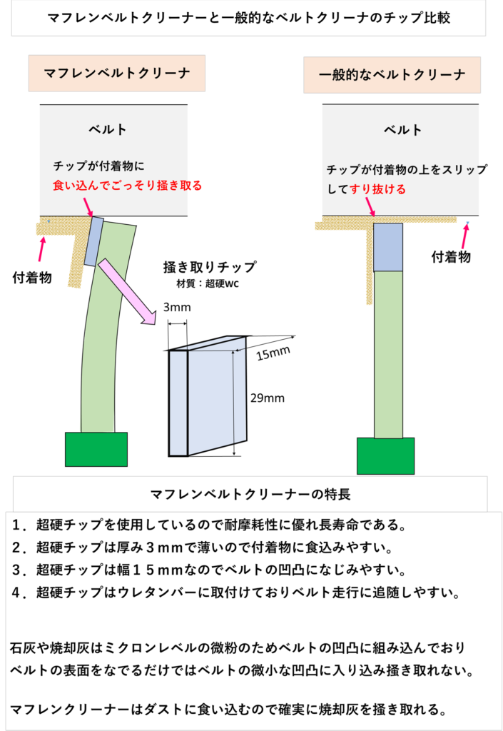 超硬チップをウレタンバーの先端に取付けた搔き取り方式は、ベルトの押付け力が低下するとウレタンバーの撓みが徐々に回復していくので搔き取り性能を把握できる。