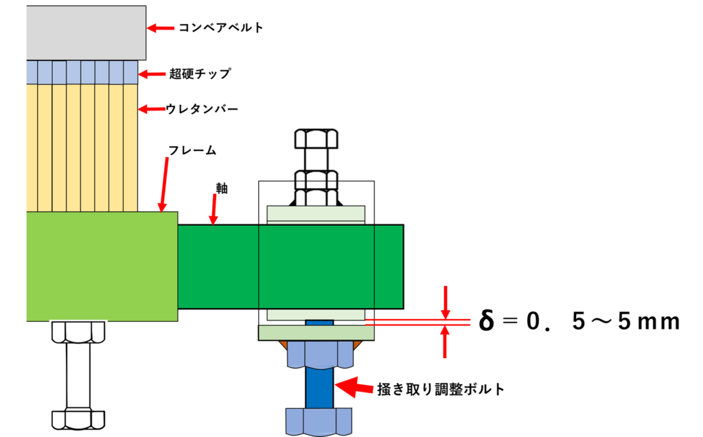 ベルトアから離れた分安全な位置に調整ボルトがあるので操業中に搔き取り状況を確認しながら調整できる。