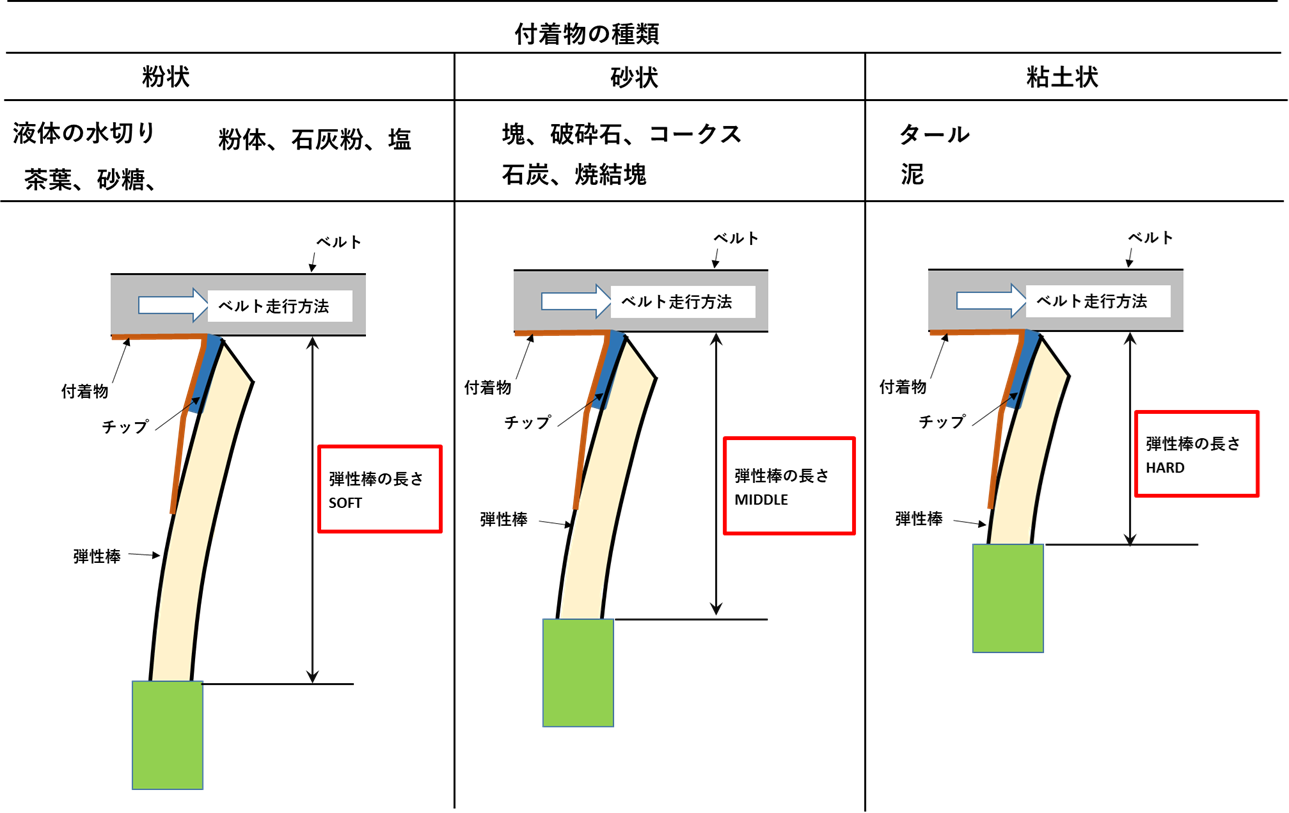 粘土状の材料は粘性が高くしかもベルトに粘着状態でくっついていますのでウレタンバーを短くして強い搔き取り力を付加する必要があります。