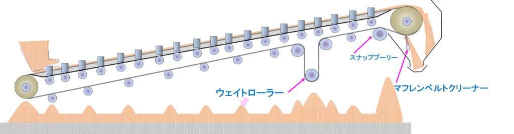 ☆問題点 ○ベルトの搬送面がスナッププーリ(入側ロールと出側ロールの2本必要)に当るのでスナッププーリが摩耗しやすく、スナッププーリの下部には付着物が堆積する。 ○スナッププーリには大きな負荷が掛かるのでベアリングが故障して起きやすい起きやすい。定期的な給脂は不可欠である。