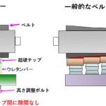 - テンション不足 (Under-tensioning):ベルトがバウンドしたり、ビビリ(チャタリング)が発生したりするのでチップの破損に繋がります。付着物がチップとベルトの間を通過し掻き取り不足が生じます。