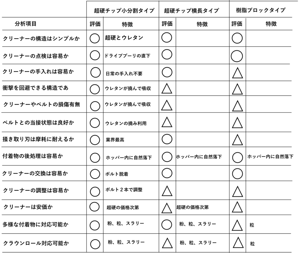 ベルトコンベアでは一つのベルトで複数の材料を搬送することも多いので、ベルトクリーナーには下表のような設計製作のコンセプトが要求されます。