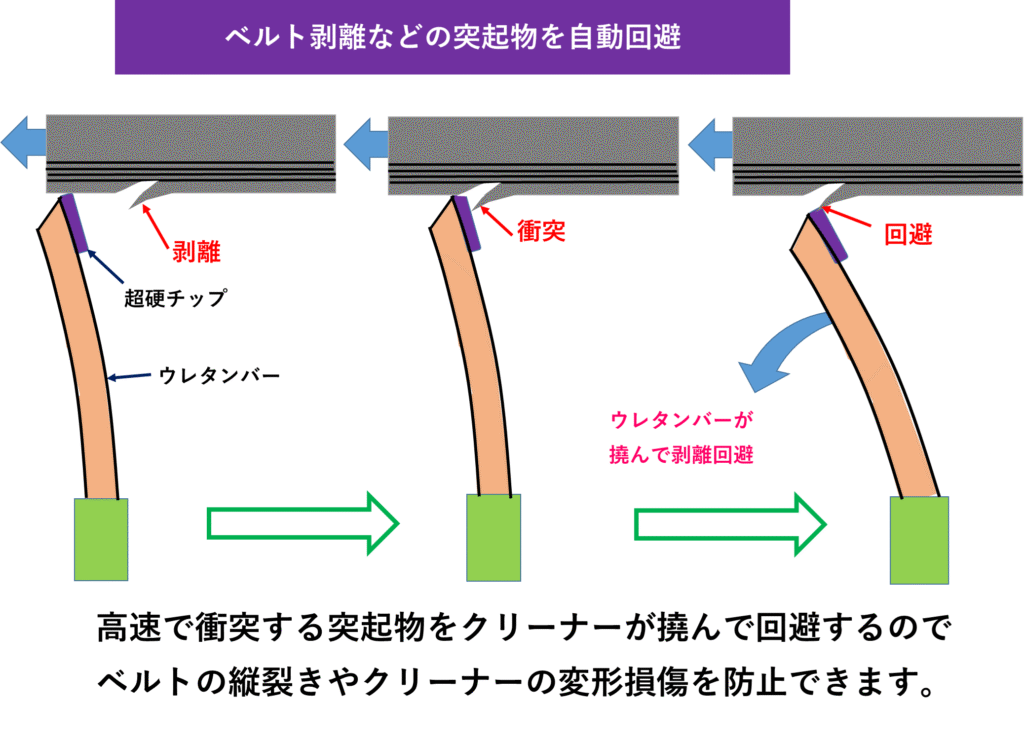 ベルトの捲れや金属刺さりなどの突起物が衝突すると瞬時にウレタンが撓んで衝撃を回避しますのでベルトクリーナーやベルトを傷めません。