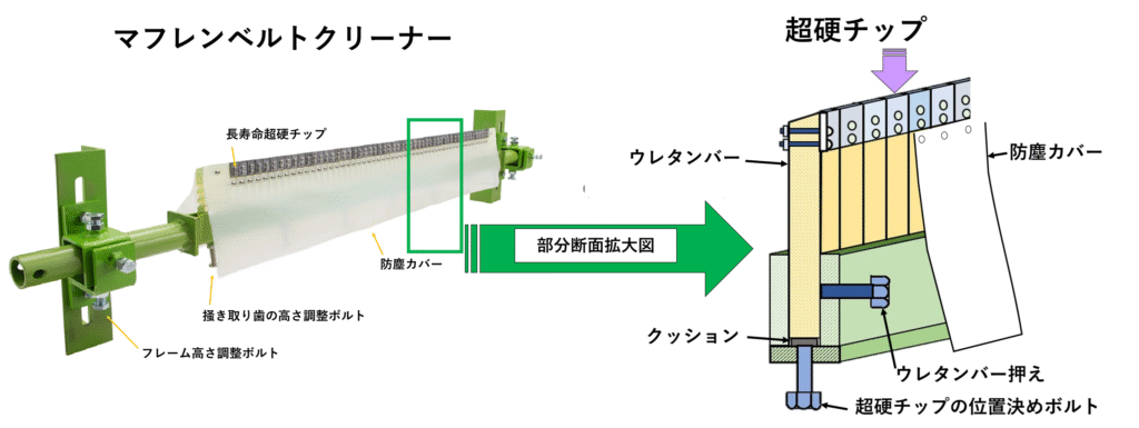 掻き取り刃(超硬チップ)が薄いので面圧が大きくなりベルトへの食込みがよくベルト速度が速くても付着物がすり抜けません。逆に通常のチップは掻き取り刃厚いので面圧が小さくなり付着物への食込みが低下し掻き取り高率が低下する。