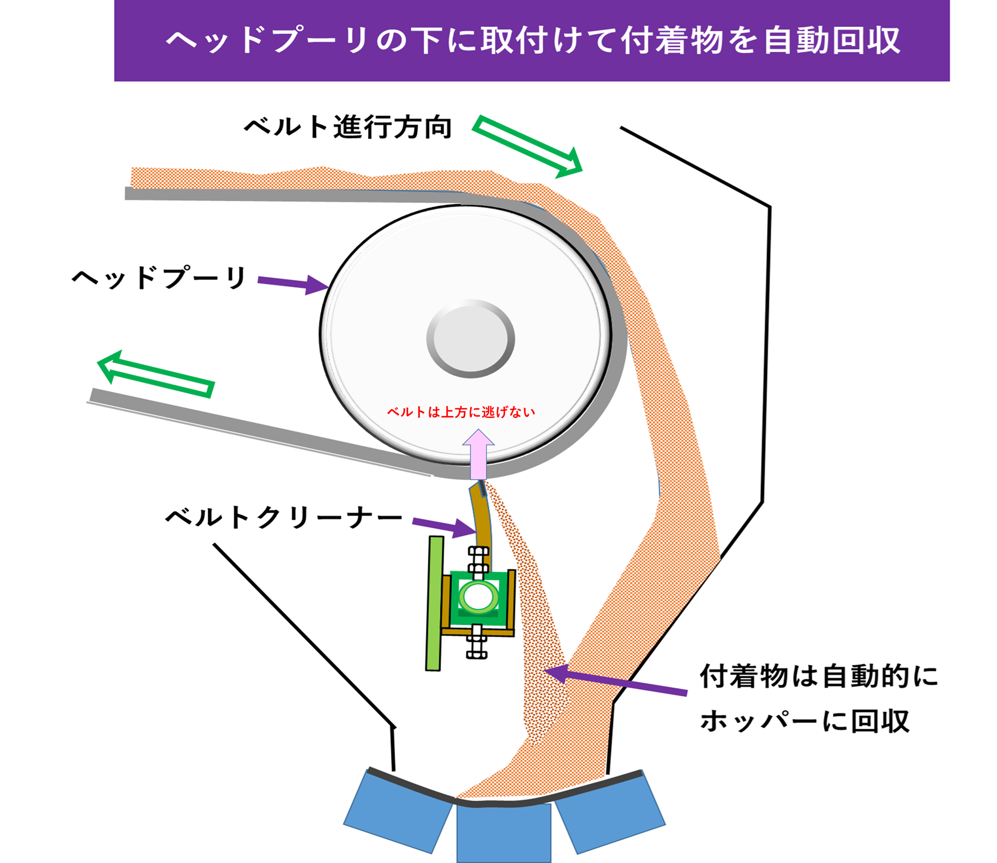 マフレンベルトクリーナーはコンパクトですのでホッパー内に設置可能です。掻き取り後の落下物を全てホッパー内に収納できますので後処理工程が不要です。